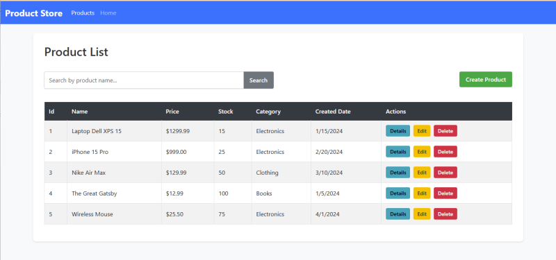 Columns: Id, Name, Price, Stock, Category, CreatedDate