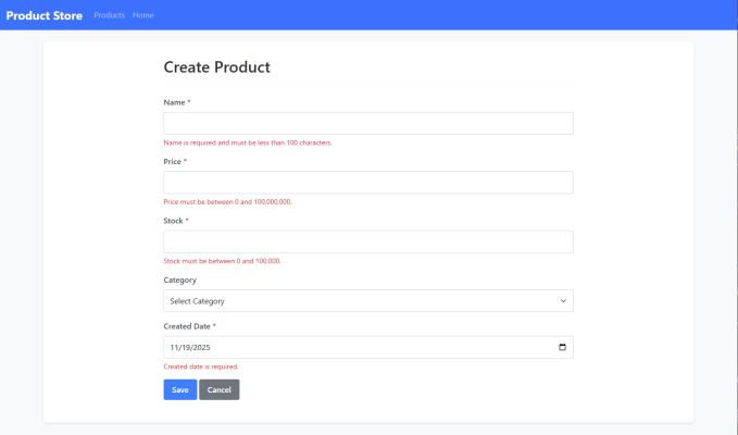 public class Product { public int Id { get; set; } [Required] [StringLength(100)] public string Name { get; set; } [Range(0, 100000000)] public decimal Price { get; set; } [Range(0, 100000)] public int Stock { get; set; } [StringLength(50)] public string Category { get; set; } [DataType(DataType.Date)] public DateTime CreatedDate { get; set; } } |