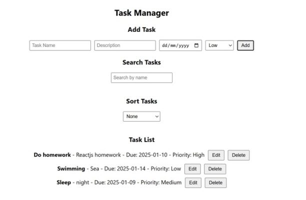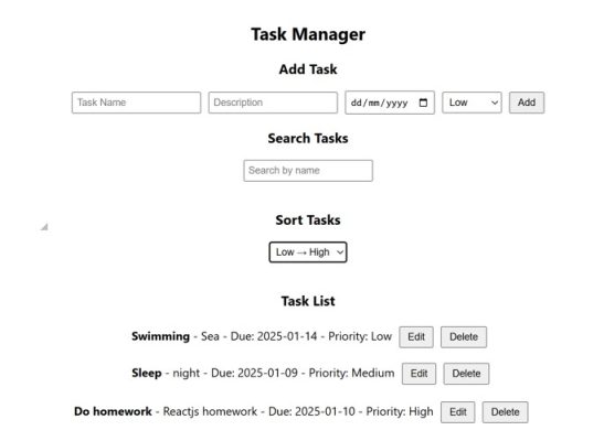 - Provide a dropdown to sort tasks by priority (Low → High, High → Low). (4 Marks)